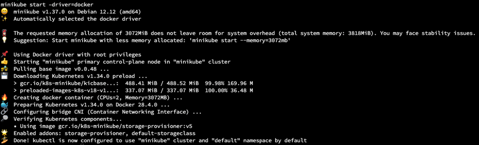 W ten sposób inicjowany jest nowy klaster Kubernetes. Flaga –driver=docker mówi Minikube, aby używał Dockera jako środowiska uruchomieniowego dla kontenerów Kubernetes.